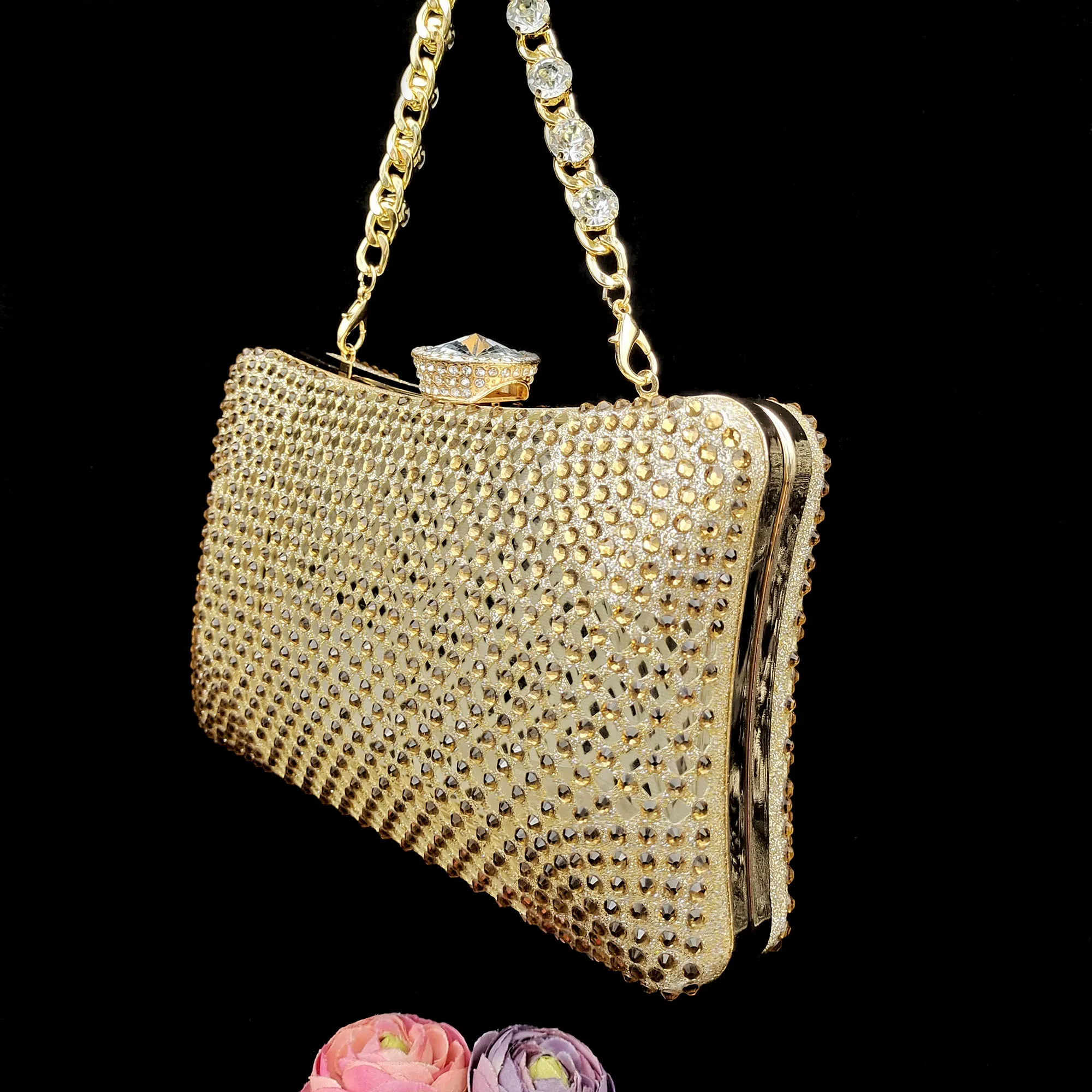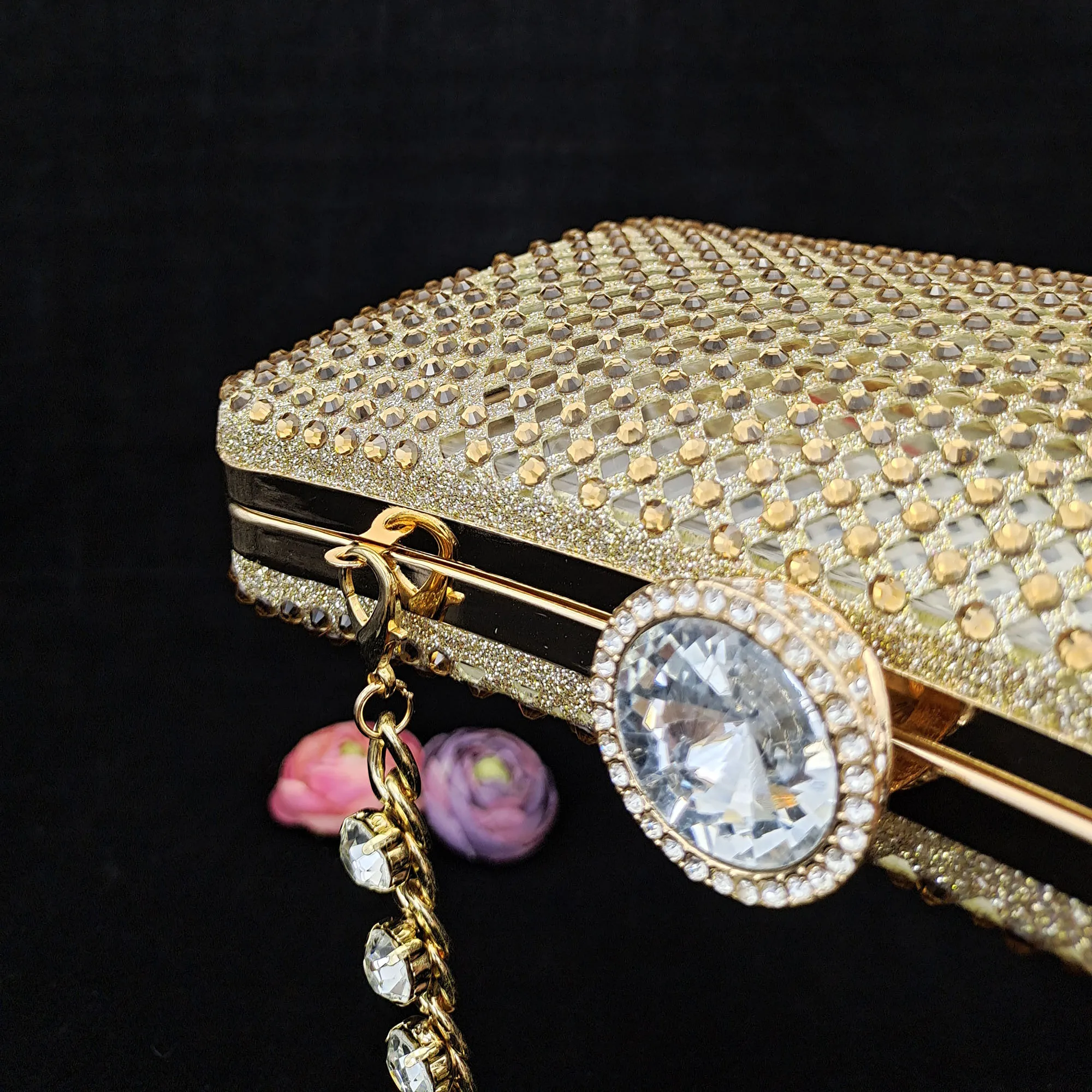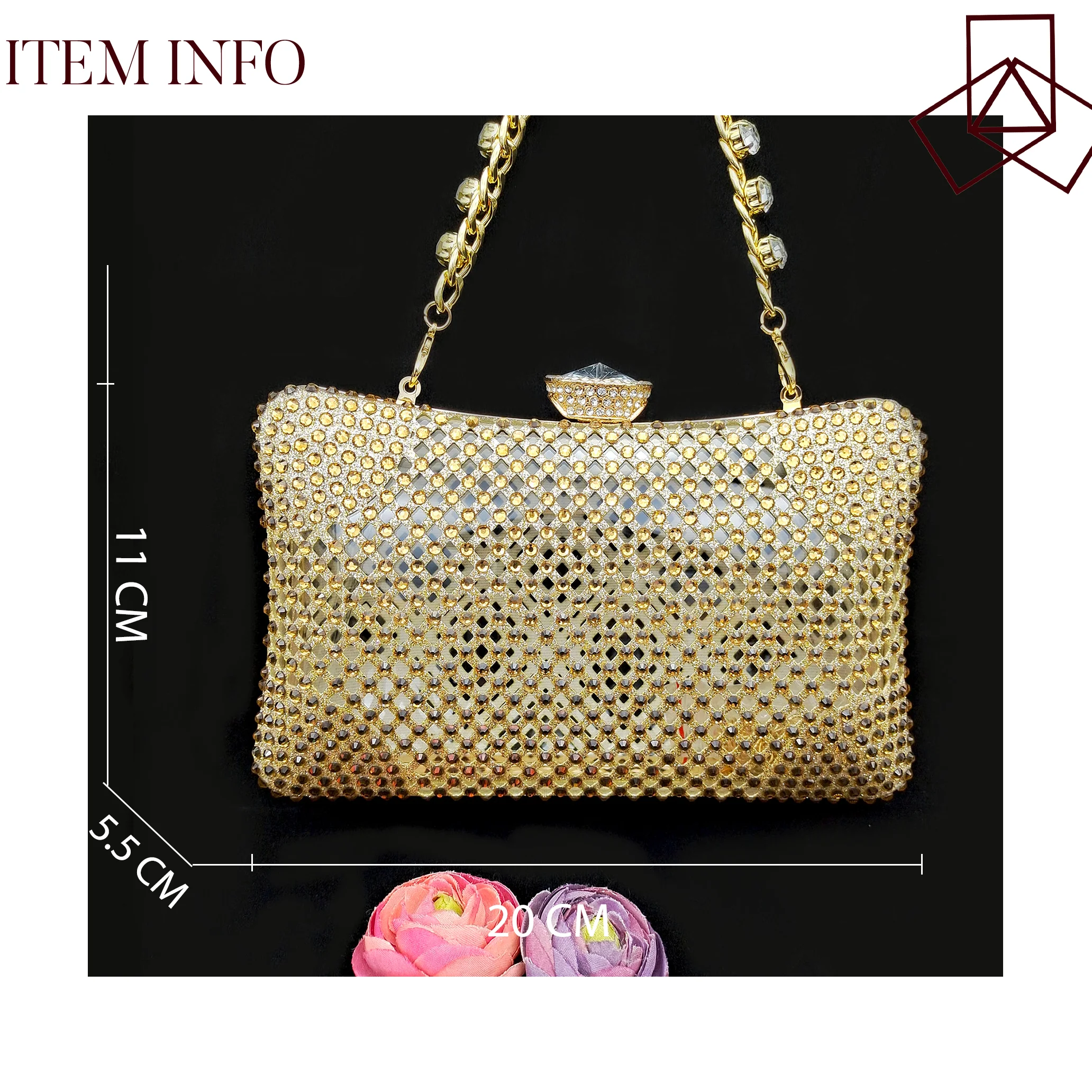 • الشنطة: شنطة صغيرة مرصعة بالكامل بحبيبات لامعة، مزودة بسلسلة ذهبية للكتف