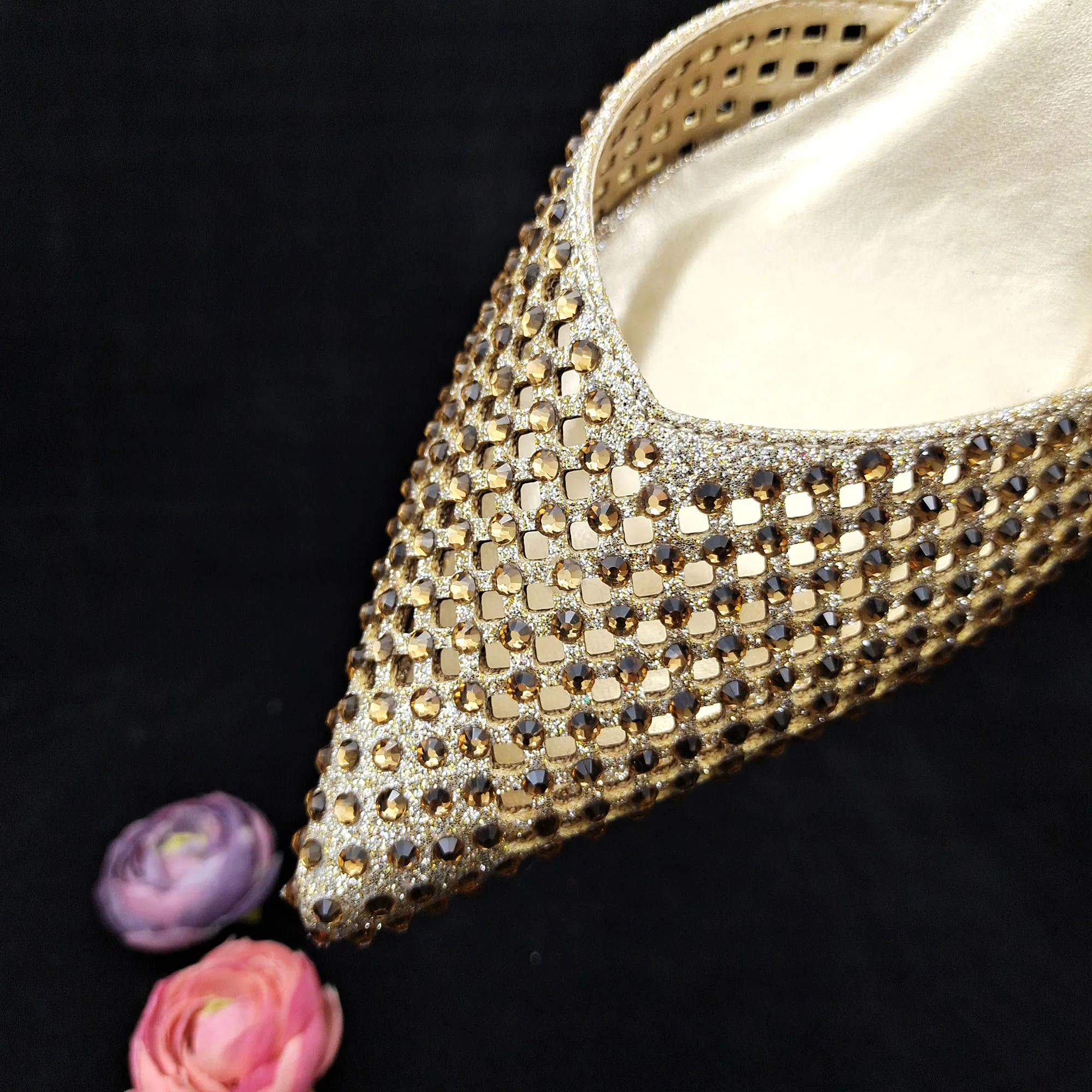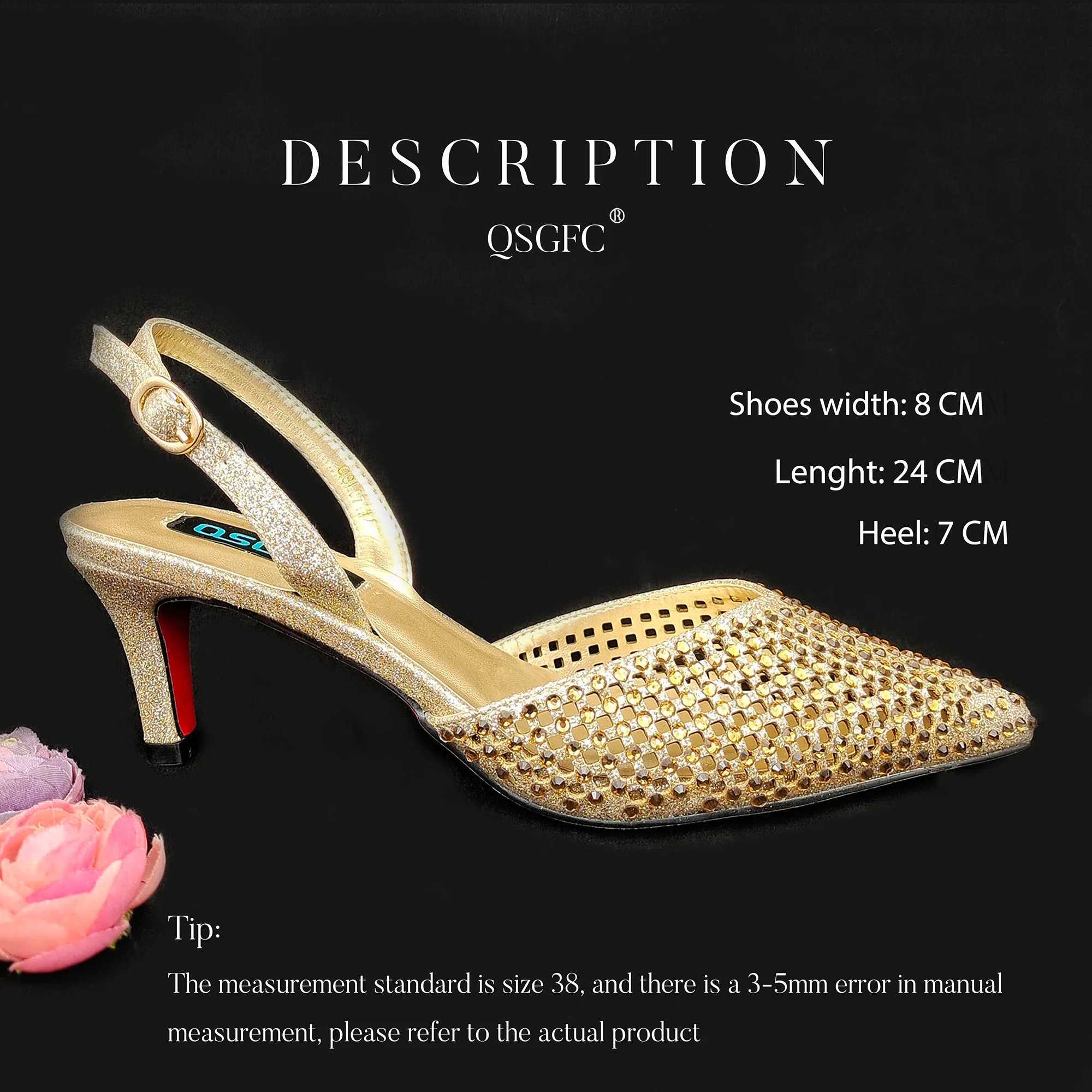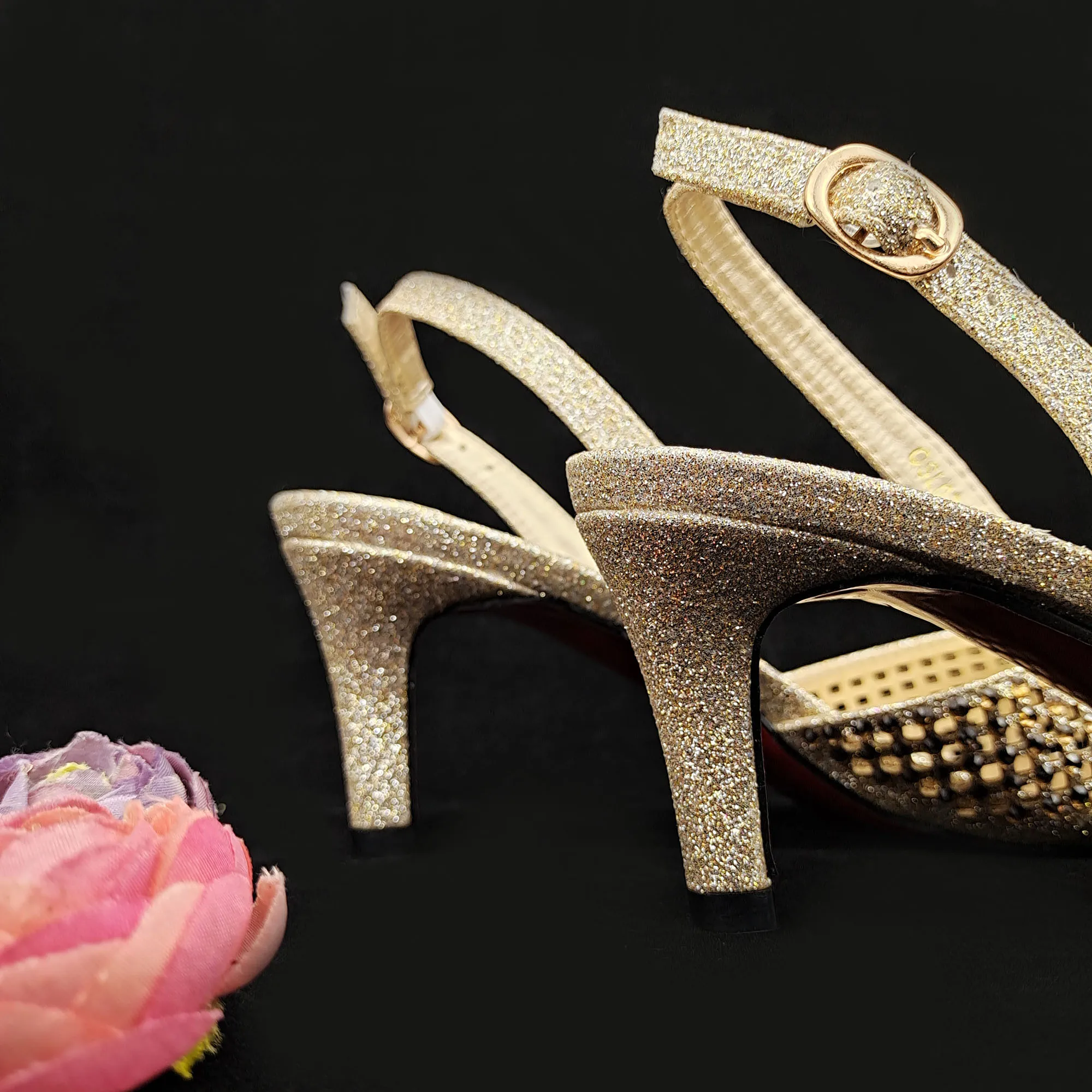 أبهري الجميع في مناسبتك القادمة مع هذا الطقم الفاخر من الحذاء والشنطة السوارية بتصميمه الإيطالي المميز المستوحى من الأناقة الملكية. اللون الذهبي البراق والتفاصيل الكريستالية المرصعة يدويًا تمنحكِ مظهرًا لافتًا وفخمًا يناسب حفلات الزفاف، الخطوبة، أو السهرات الكبرى.